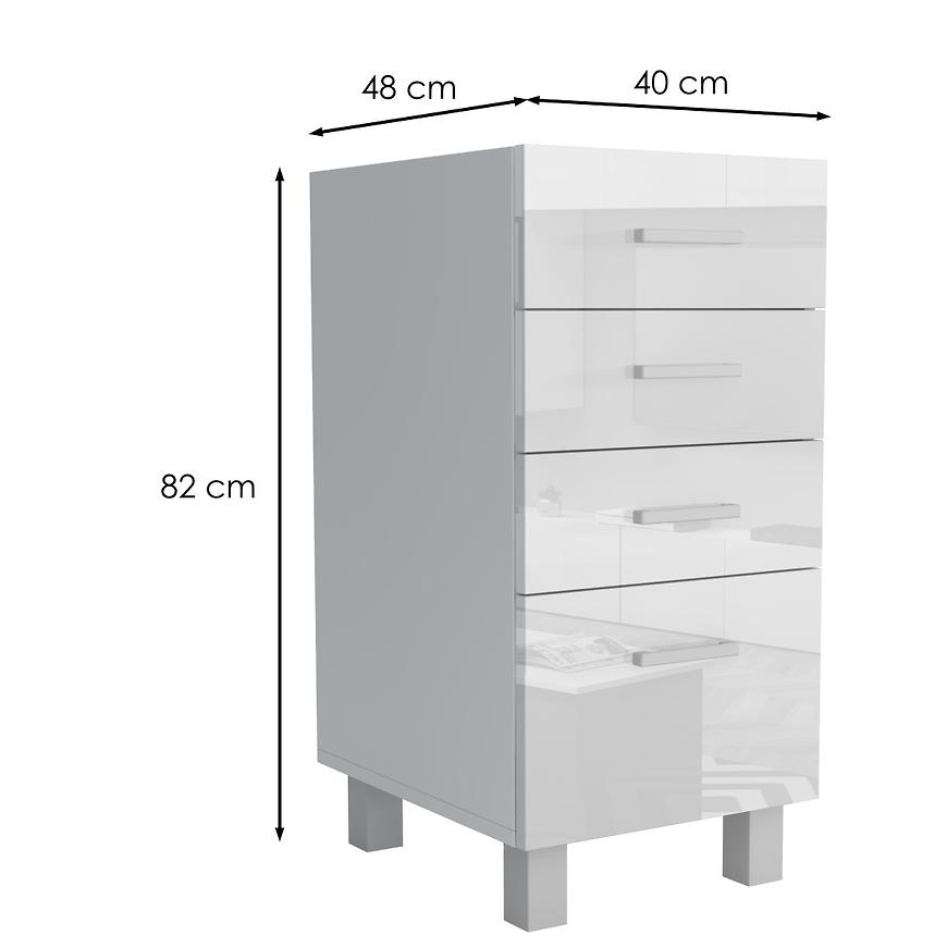 Biały matowy korpus kontrastuje z błyszczącymi frontami, tworząc harmonijny wygląd szafki. Trwała konstrukcja mebli wykonana z płyty MDF i płyty wiórowej laminowanej zapewnia stabilność i wytrzymałość.