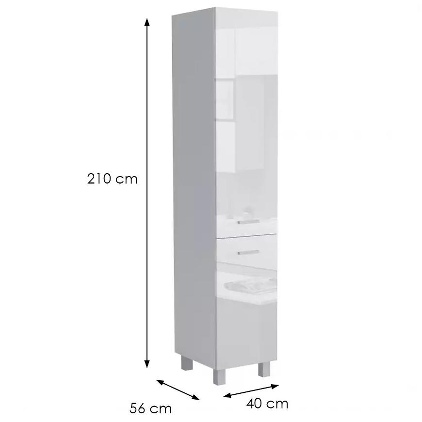 Biały matowy korpus kontrastuje z błyszczącymi frontami, tworząc harmonijny wygląd szafki. Trwała konstrukcja mebli wykonana z płyty MDF i płyty wiórowej laminowanej zapewnia stabilność i wytrzymałość.