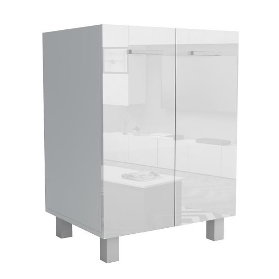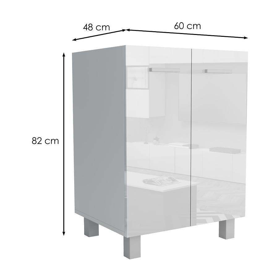 Biały matowy korpus kontrastuje z błyszczącymi frontami, tworząc harmonijny wygląd szafki. Trwała konstrukcja mebli wykonana z płyty MDF i płyty wiórowej laminowanej zapewnia stabilność i wytrzymałość.