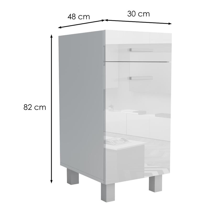Biały matowy korpus kontrastuje z błyszczącymi frontami, tworząc harmonijny wygląd szafki. Trwała konstrukcja mebli wykonana z płyty MDF i płyty wiórowej laminowanej zapewnia stabilność i wytrzymałość.