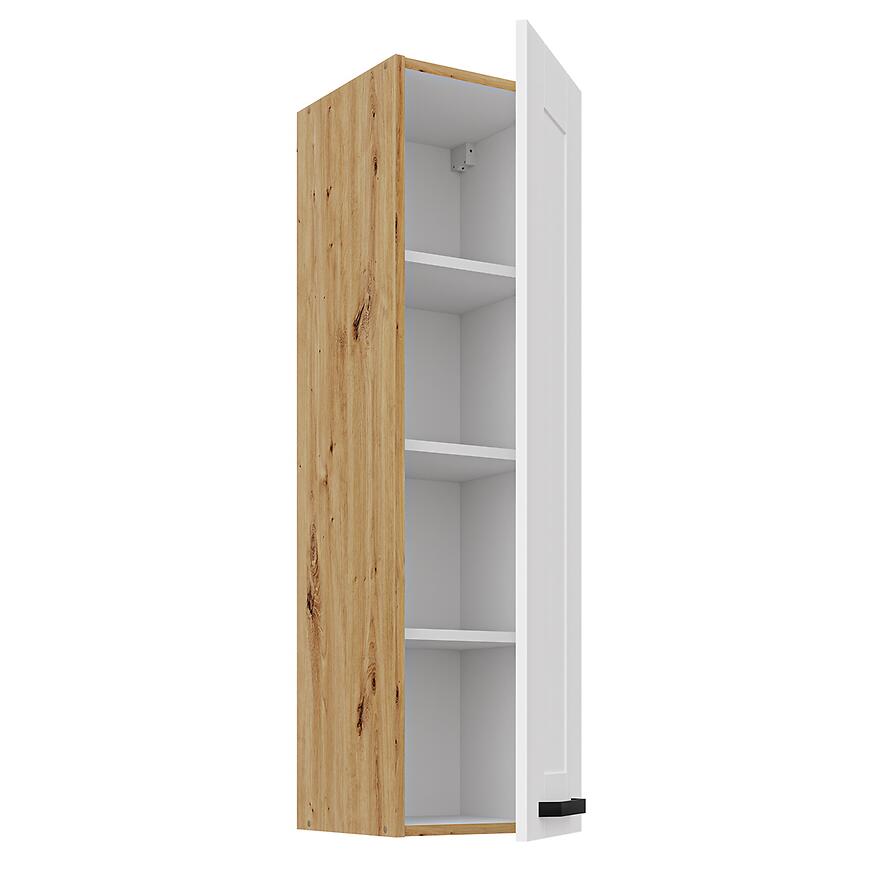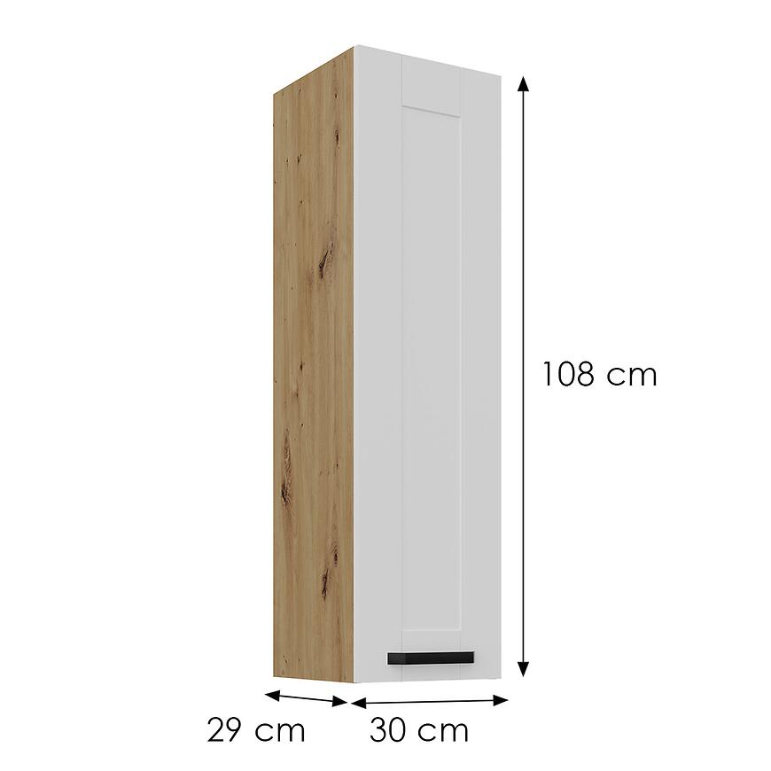 Szafka kuchenna Luna biały mat/artisan 30G-108 1F to kompaktowy moduł górnej zabudowy kuchennej, który łączy nowoczesny design z ciepłym akcentem drewnianego korpusu. Należy do kolekcji LUNA, wyróżniającej się frontami w matowej bieli oraz korpusem w kolorze dąb artisan, co nadaje kuchni elegancki i przytulny charakter.