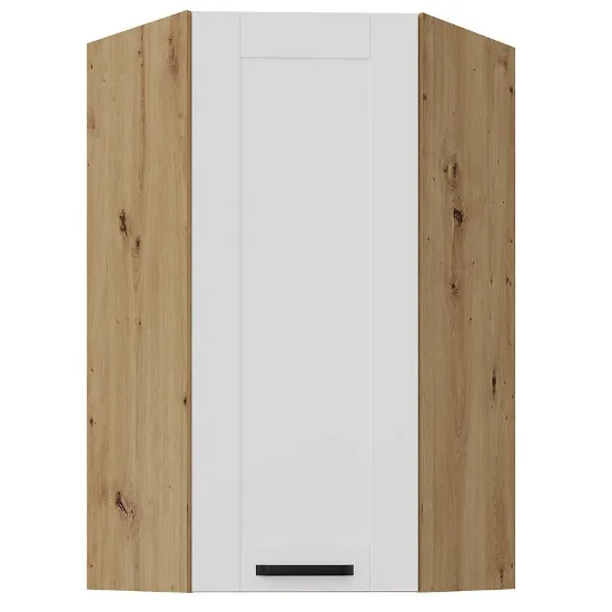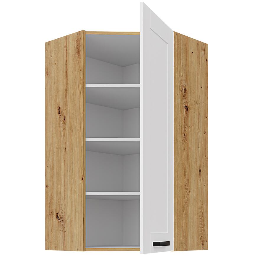 Szafka kuchenna Luna biały mat/artisan 60x60 GN-108 1F (45°) to funkcjonalny i stylowy element górnej zabudowy narożnej kuchni. Należy do kolekcji LUNA, która łączy minimalistyczny design, wysoką jakość materiałów i nowoczesne wykończenie. Szafka narożna o wymiarach 60x60 cm oferuje praktyczne miejsce do przechowywania naczyń, akcesoriów kuchennych i produktów spożywczych, pozwalając efektywnie wykorzystać przestrzeń narożnika.