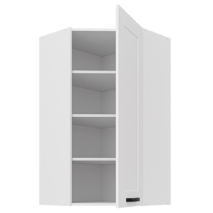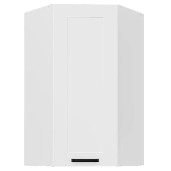 Szafka kuchenna Luna biały mat/biały 60x60 GN-108 1F (45°) to narożny moduł górnej zabudowy kuchennej, który łączy minimalistyczny design z funkcjonalnym wykorzystaniem przestrzeni narożnej w kuchni. Należy do kolekcji LUNA, wyróżniającej się frontami w matowej bieli i jednolitym, białym korpusem, które nadają wnętrzu nowoczesny i harmonijny wygląd.