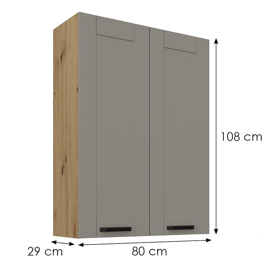 Szafka kuchenna Luna claygrey/artisan 80G-108 2F to duży moduł górnej zabudowy kuchennej, łączący nowoczesny design z funkcjonalnością. Należy do kolekcji LUNA, wyróżniającej się frontami w matowym kolorze claygrey oraz korpusem w odcieniu dąb artisan, co nadaje kuchni elegancki, przytulny charakter.