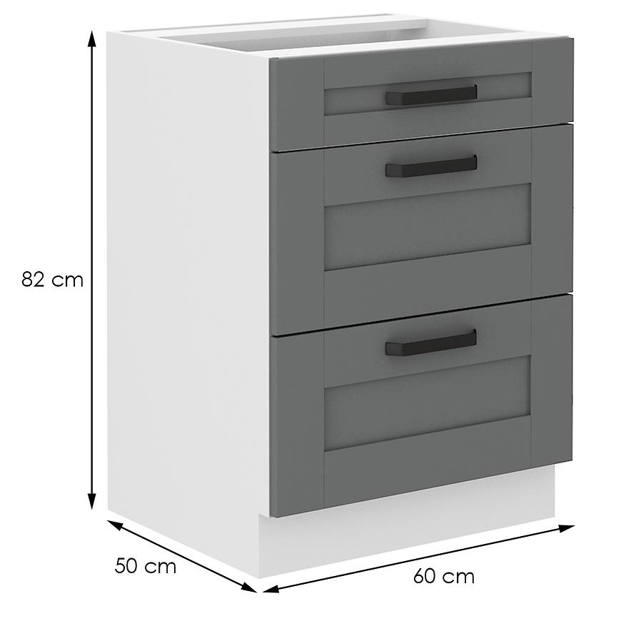 Szafka wyposażona jest w trzy obszerne szuflady, co sprawia, że idealnie nadaje się do przechowywania różnorodnych artykułów kuchennych. Ergonomiczne wnętrze szuflad umożliwia praktyczne rozmieszczenie przedmiotów, co ułatwia utrzymanie kuchni w porządku.
