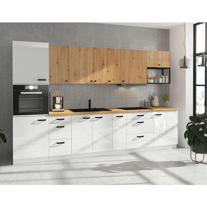 Fronty i korpus dolnych mebli w kolorze białym połysk wykonane są z płyty wiórowej laminowanej, co gwarantuje trwałość i odporność na uszkodzenia. Fronty szafek górnych, utrzymane w matowym wykończeniu dąb artisan, charakteryzują się nie tylko estetyką, ale także trwałością, dzięki konstrukcji z MDF foliowanego. Ten materiał gwarantuje solidność oraz odporność na warunki kuchenne, tworząc efektowną i łatwą do utrzymania w czystości powierzchnię. Matowe wykończenie korpusu w kolorze białym tworzy kontrast do frontów, jednocześnie podkreślając nowoczesny charakter szafki. Konstrukcja korpusu oparta jest na płycie wiórowej laminowanej, co zapewnia trwałość i stabilność. Cichy domyk w zestawie to praktyczna cecha, która sprawia, że otwieranie i zamykanie szafki odbywa się płynnie i bez zbędnego hałasu, co z pewnością podniesie komfort użytkowania kuchni.