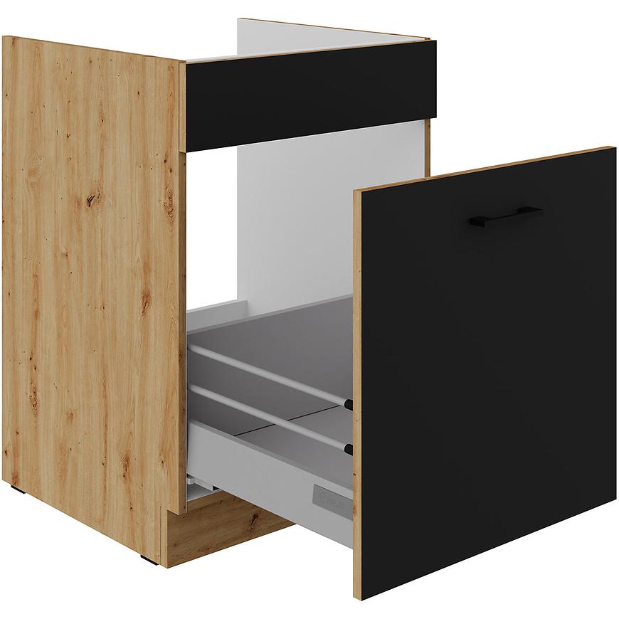 Szafka kuchenna Modena 60ZL 1S BB o wymiarach 60x52x82 cm to praktyczny i elegancki element wyposażenia kuchni. Połączenie matowych czarnych frontów z korpusem w ciemnym drewnopodobnym kolorze artisan nadaje wnętrzu nowoczesnego charakteru, który świetnie sprawdzi się w minimalistycznych i industrialnych aranżacjach.
