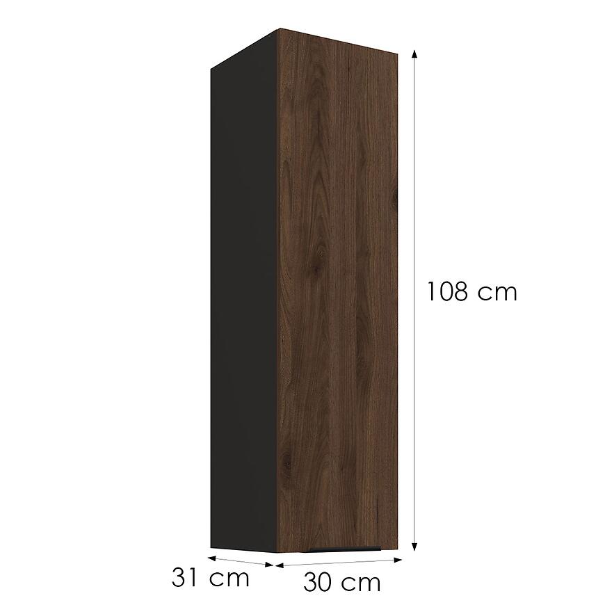 Wąska szerokość 30 cm, wysokość 108 cm oraz głębokość 31 cm sprawiają, że szafka idealnie nadaje się do uzupełnienia ciągu górnych szafek lub zagospodarowania wolnej przestrzeni pomiędzy innymi modułami. To praktyczne rozwiązanie pozwala zachować spójność zabudowy i porządek w kuchni.