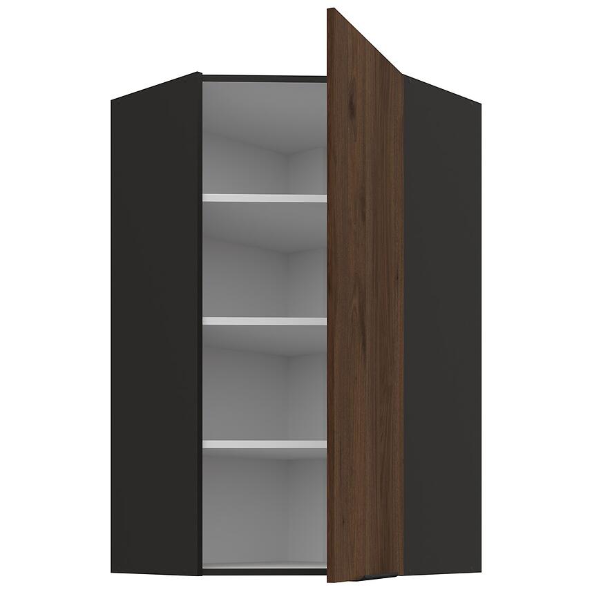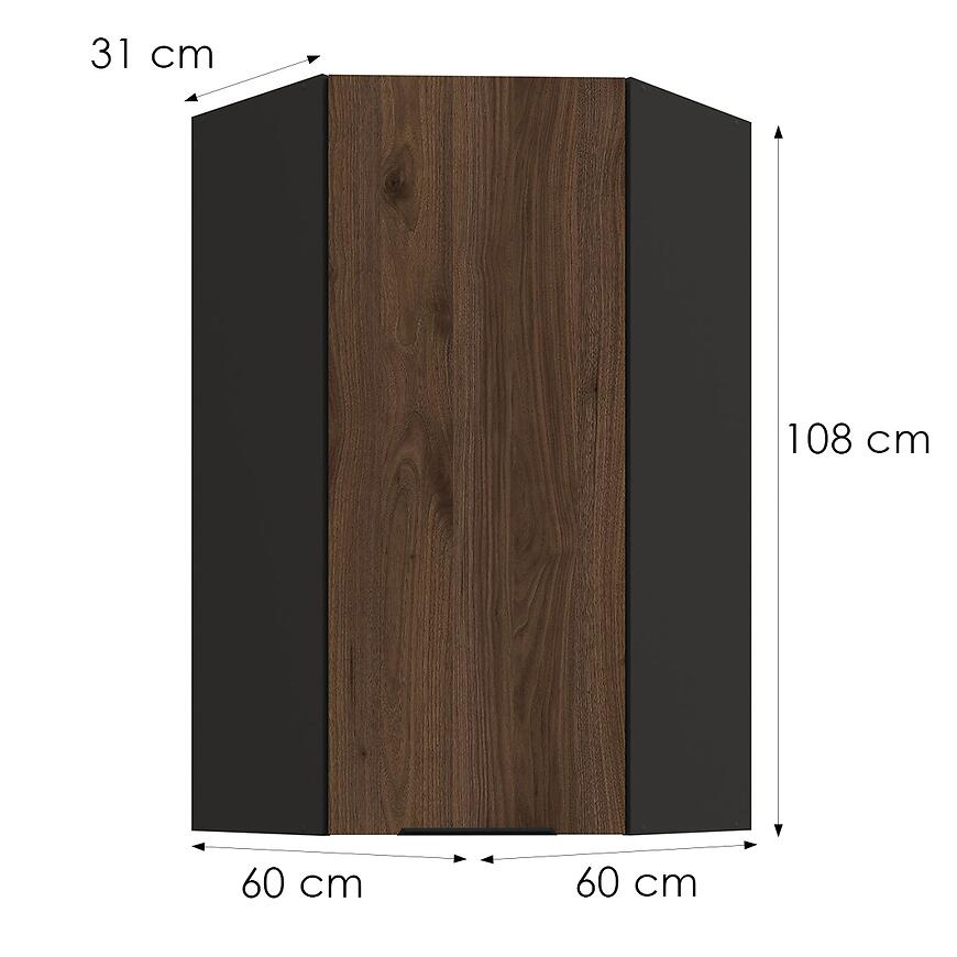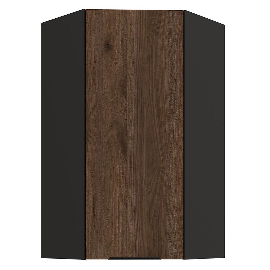 Szafka kuchenna Monza orzech okapi 60x60 GN-108 1F (45°) to narożny moduł górnej zabudowy kuchennej, który łączy funkcjonalność z eleganckim designem. Należy do kolekcji MONZA, która łączy ciemne, drewnopodobne fronty z kontrastującymi czarnymi korpusami, tworząc nowoczesną i stylową kuchnię. Model z frontem otwieranym pod kątem 45° pozwala wygodnie zagospodarować narożniki kuchni, ułatwiając dostęp do wnętrza szafki.