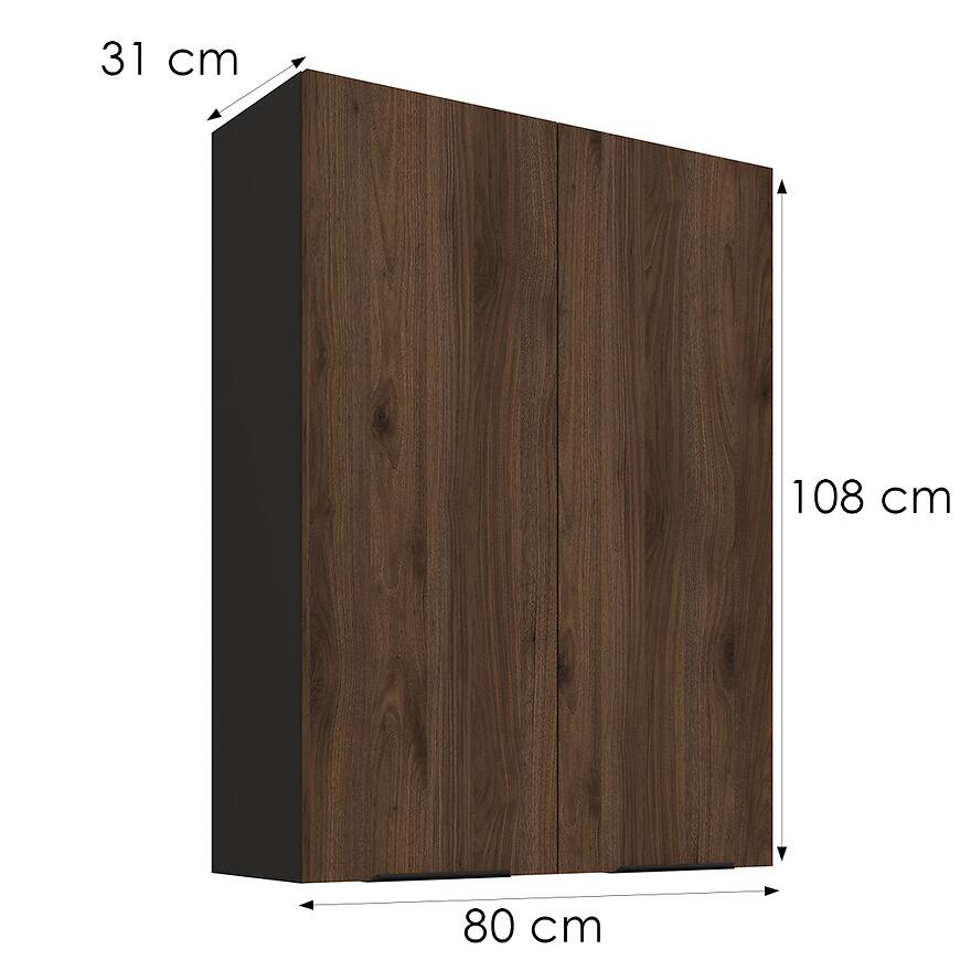 Szafka kuchenna Monza orzech okapi 80G-108 2F to przestronny moduł górnej zabudowy kuchennej, który łączy funkcjonalność z eleganckim designem. Należy do kolekcji MONZA, która łączy ciemne, drewnopodobne fronty z kontrastującymi czarnymi korpusami, tworząc nowoczesną i stylową aranżację kuchni. Model z dwoma frontami doskonale sprawdzi się w większych ciągach górnych szafek, zapewniając wygodny dostęp do wnętrza i maksymalizując przestrzeń do przechowywania.