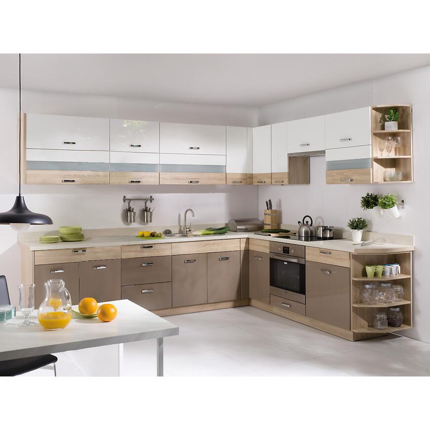 Szafka kuchenna Premio 80 cm to funkcjonalny element wyposażenia kuchni, który łączy nowoczesny wygląd z praktycznym wykorzystaniem przestrzeni. Model z kolekcji PREMIO wyróżnia się eleganckim zestawieniem kolorystycznym – korpus w odcieniu dąb sonoma oraz fronty sonoma / cappuccino połysk. Dzięki temu mebel doskonale wpisuje się zarówno w nowoczesne, jak i klasyczne aranżacje kuchenne.