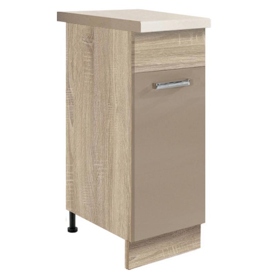 Kuchnia Premio to zestaw praktyczny i funkcjonalny. Połączenie koloru dębu sonomy i cappucino to ciekawe i ponadczasowe rozwiązanie. Fronty kuchenne wykonane w są z MDF foliowany. Korpus kuchni wykonany jest z płyty wiórowej laminowanej w kolorze dąb sonoma.