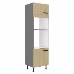 Fronty (kolor: drewnopodobne) i korpusy (kolor: antracyt) wykonane z odpornej płyty wiórowej laminowanej z wykończeniem matowym. Szafki posiadają cichy domyk w zestawie.