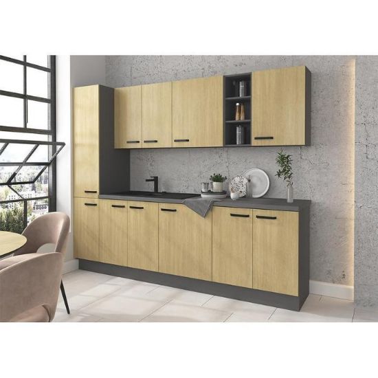 Fronty (kolor: drewnopodobne) i korpusy (kolor: antracyt) wykonane z odpornej płyty wiórowej laminowanej z wykończeniem matowym. Szafki posiadają cichy domyk w zestawie.