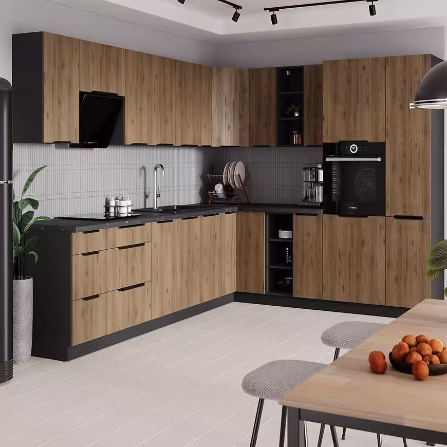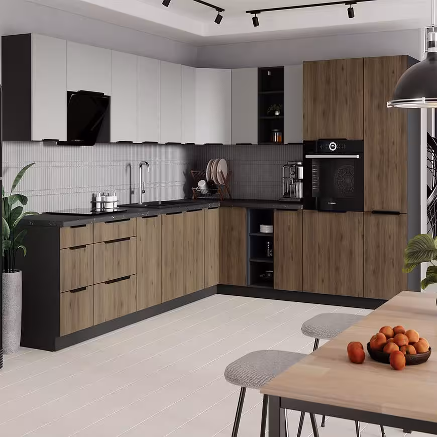 Kolekcja Monza dostępna jest w kolorze orzech okapi/czarny, to harmonia funkcjonalności i wyrafinowanego designu. Oferując oryginalny kolor frontów w odcieniu orzecha okapi oraz elegancki czarny korpus, kolekcja Monza wprowadza do kuchni nowoczesność i styl.