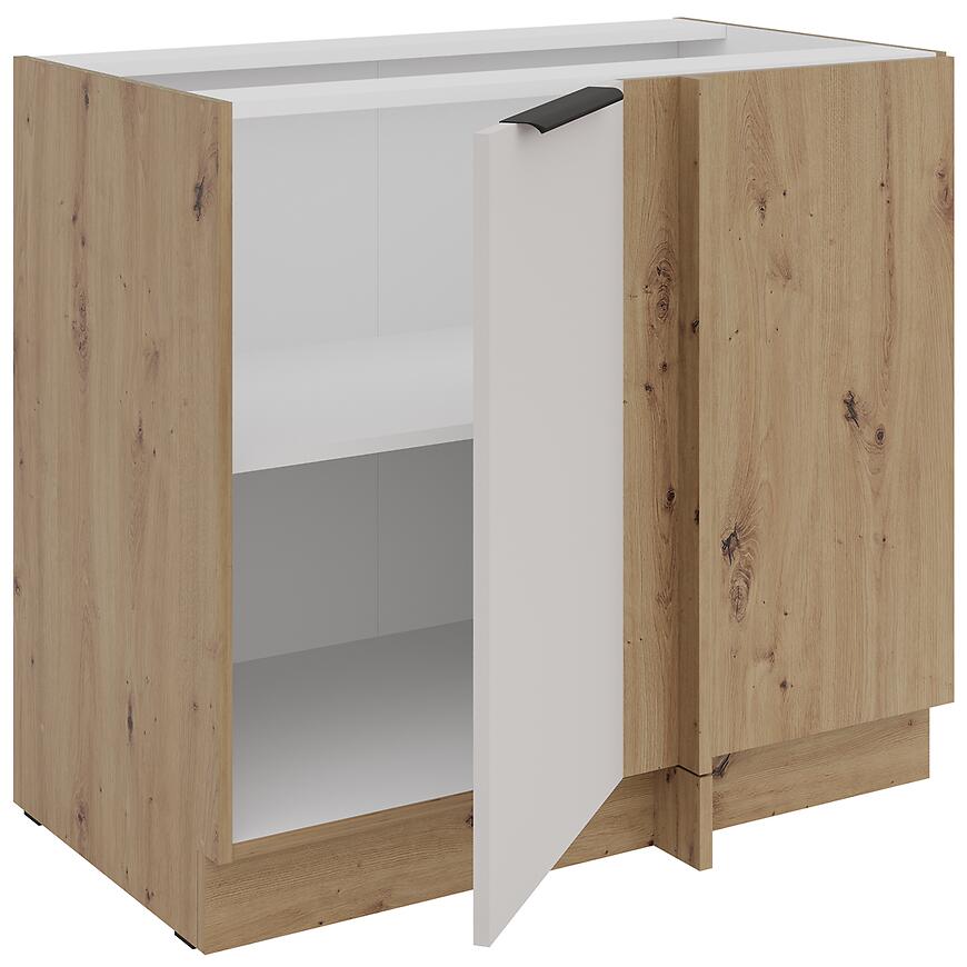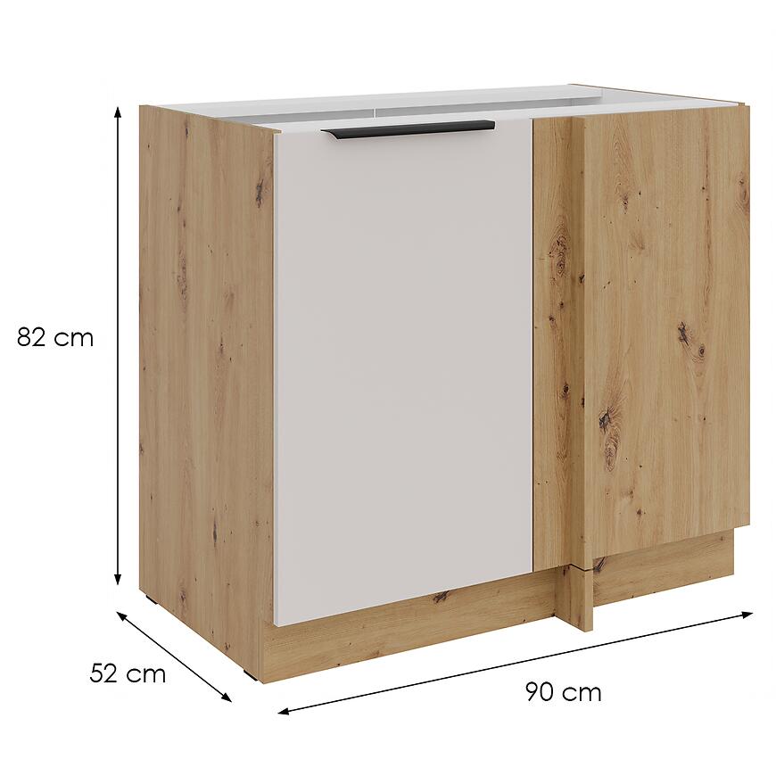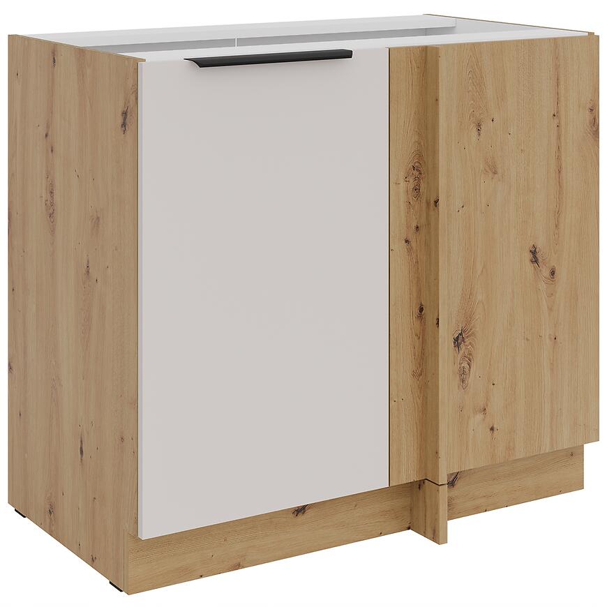 Korpus w jasnym, drewnopodobnym dębie artisan podkreśla naturalny charakter szafki, a cokół w tym samym kolorze gwarantuje spójny i estetyczny wygląd zabudowy. Brak nóg i blatu w zestawie daje swobodę dopasowania szafki do indywidualnej aranżacji kuchni.