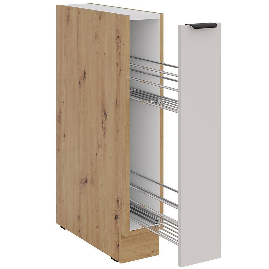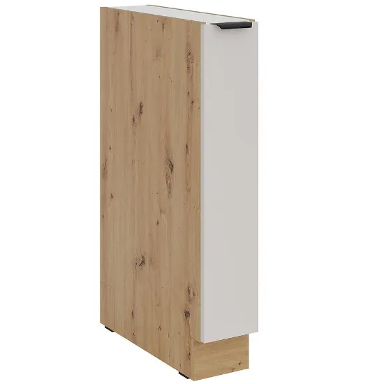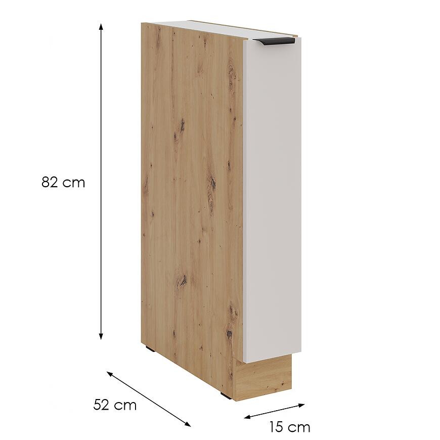 Szafka kuchenna Solea cashmere/artisan 15D CARGO BB z kolekcji SOLEA to funkcjonalny i kompaktowy moduł dolnej zabudowy, który pozwala efektywnie wykorzystać wąskie przestrzenie kuchenne. Matowe fronty w odcieniu cashmere harmonizują z jasnym korpusem dąb artisan, tworząc spójny i elegancki wygląd. Wymiary 82 × 15 × 52 cm sprawiają, że szafka idealnie nadaje się do wąskich szczelin, uzupełniając większą zabudowę kuchenną.