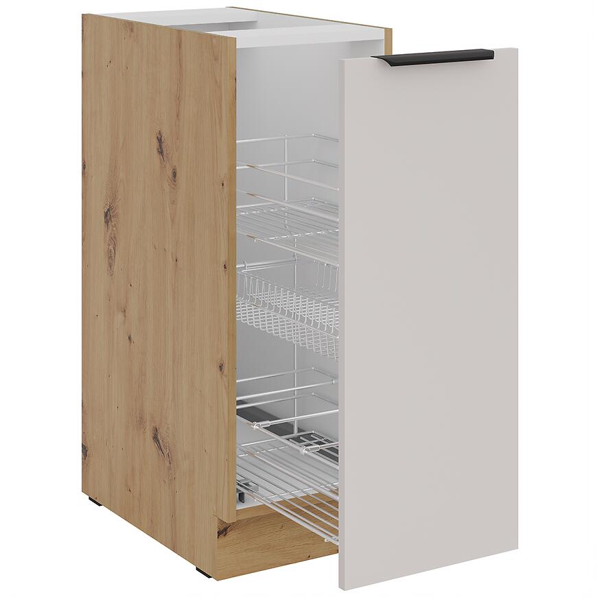 Szafka 30D CARGO BB wyposażona jest w funkcjonalny mechanizm cargo, który umożliwia wygodne przechowywanie przypraw, butelek i drobnych produktów spożywczych w sposób uporządkowany i łatwo dostępny. Fronty z płyty wiórowej laminowanej w matowym wykończeniu i beżowym odcieniu wprowadzają do wnętrza ciepło i subtelną elegancję.