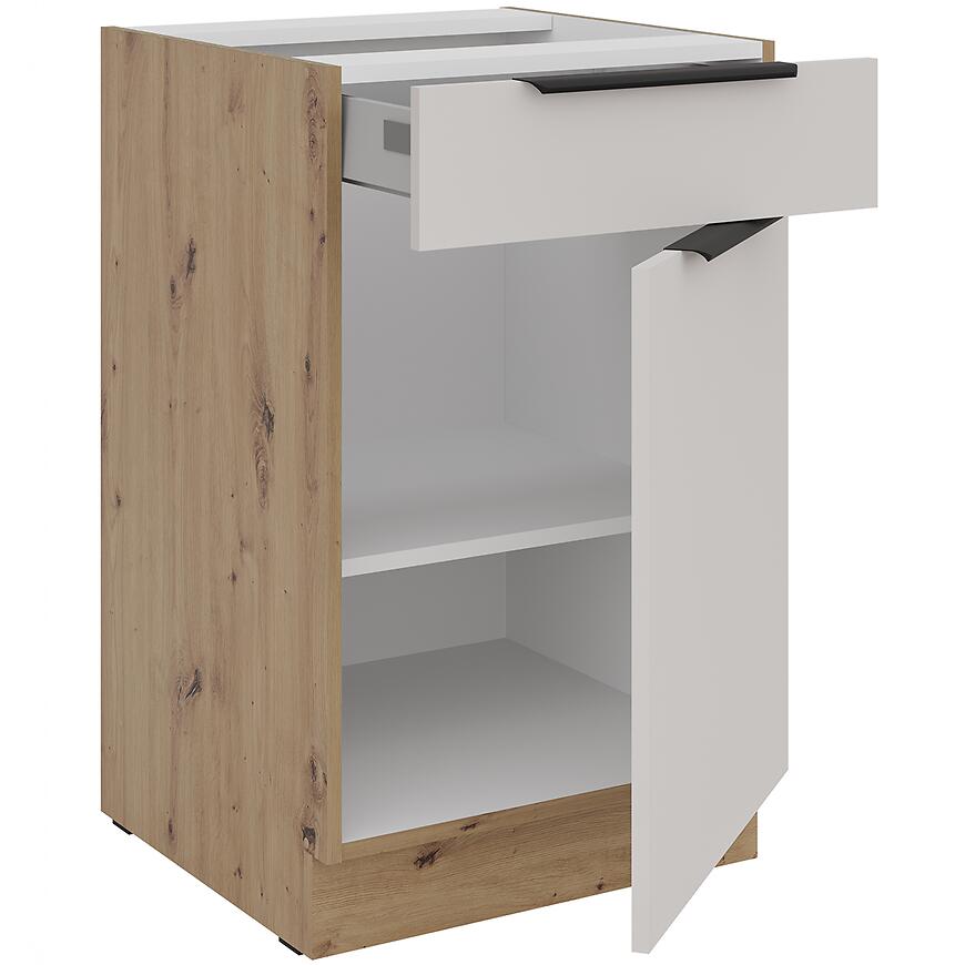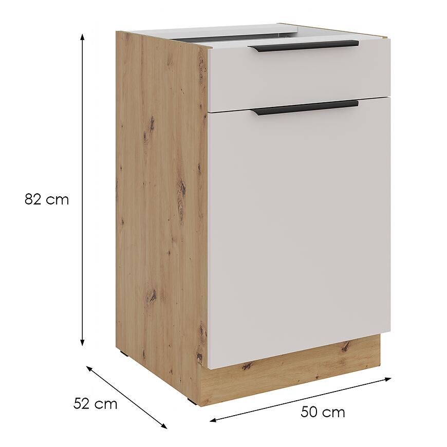 Model 50D 1F 1S BB wyposażono w szufladę oraz drzwi, co pozwala na wygodne przechowywanie sztućców, przyborów kuchennych oraz większych akcesoriów. Fronty z płyty wiórowej laminowanej w matowym wykończeniu i beżowym odcieniu wprowadzają do wnętrza ciepło i subtelną elegancję.