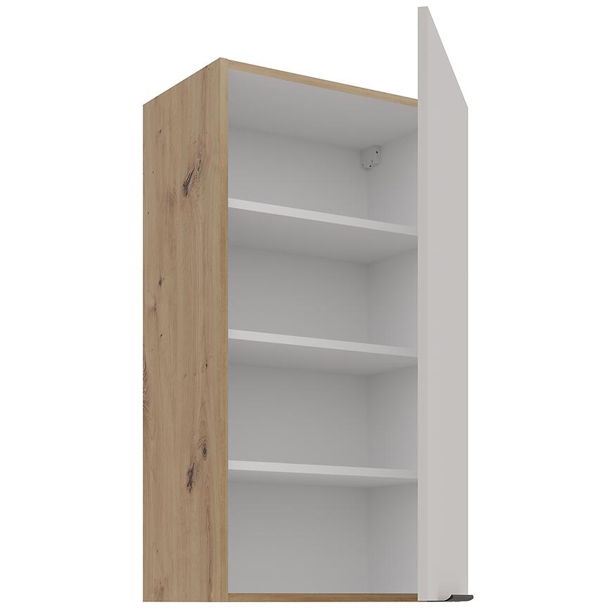 Korpus w jasnym, drewnopodobnym dębie artisan podkreśla naturalny charakter szafki, a cokół w tym samym kolorze zapewnia spójny i estetyczny wygląd całej zabudowy. Brak nóg w zestawie umożliwia łatwe dopasowanie szafki do systemowej aranżacji kuchni.