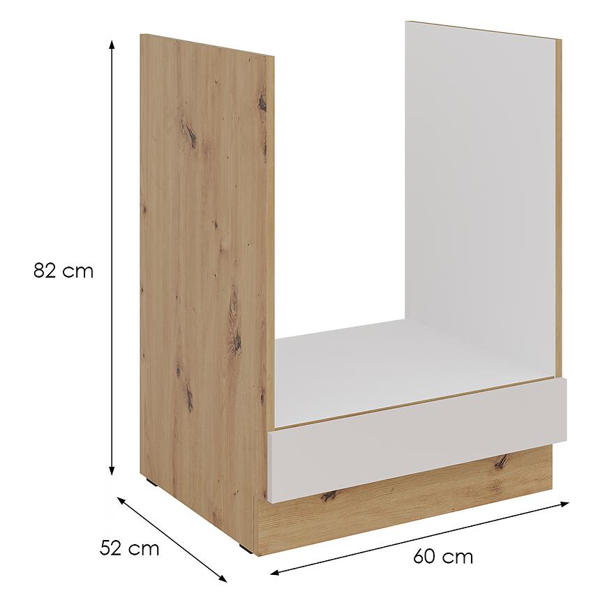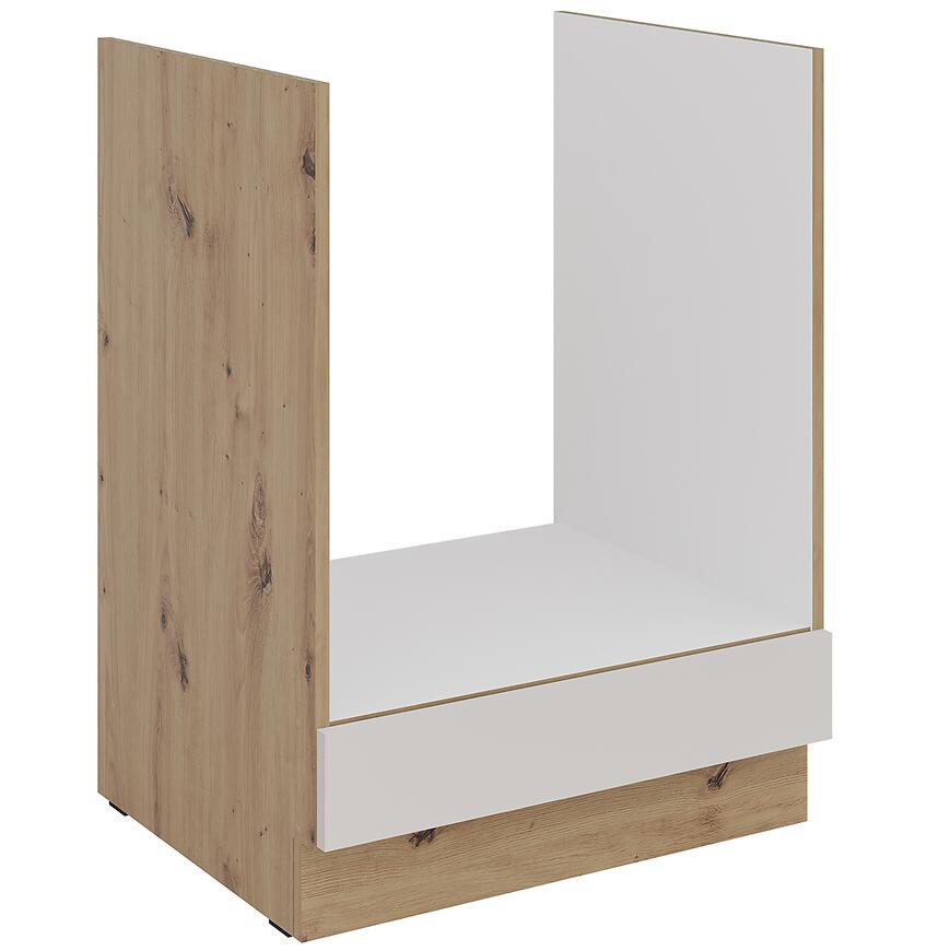 Fronty wykonane z płyty wiórowej laminowanej o matowym wykończeniu i beżowym odcieniu wprowadzają do wnętrza ciepło i subtelną elegancję. Korpus w jasnym, drewnopodobnym dębie artisan podkreśla naturalny charakter szafki, a cokół dopasowany kolorystycznie do korpusu zapewnia jednolity wygląd zabudowy. Brak nóg i blatu w zestawie daje swobodę dopasowania szafki do indywidualnego projektu kuchni.