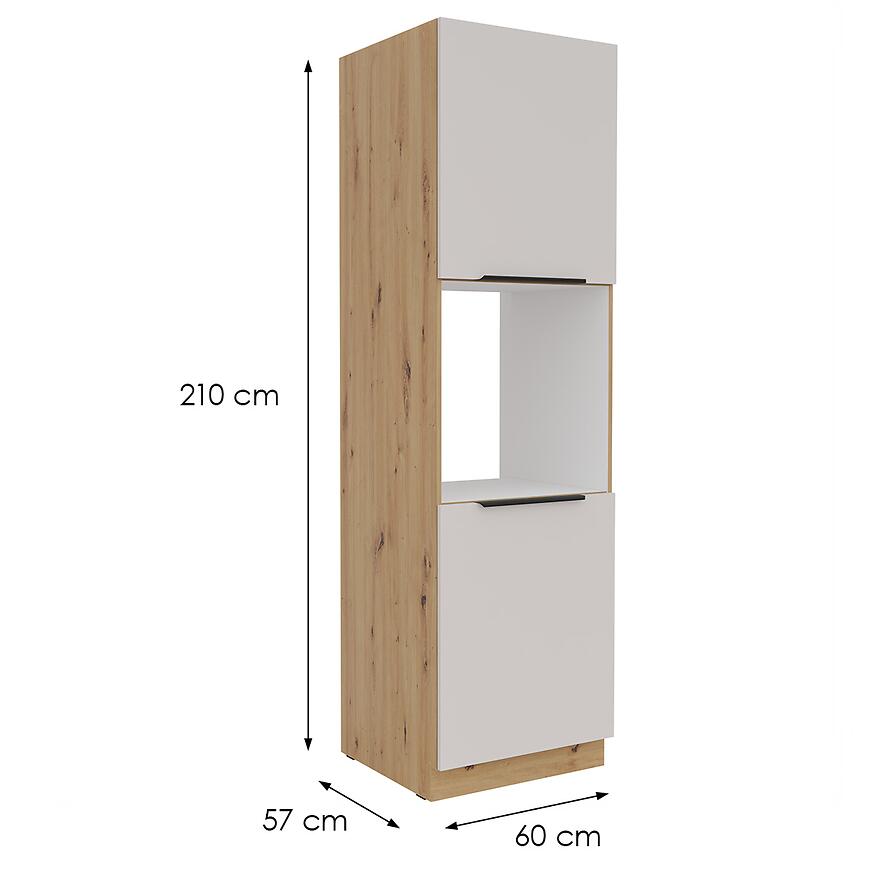 Szafka kuchenna Solea cashmere/artisan 60DP-210 2F z kolekcji SOLEA to wysoka i pojemna kolumna kuchenna, która łączy nowoczesny design z funkcjonalnym układem wnętrza. Matowe fronty w odcieniu cashmere harmonizują z jasnym korpusem dąb artisan, tworząc elegancką i spójną zabudowę kuchenną. Wymiary 210 × 60 × 57 cm sprawiają, że szafka doskonale sprawdzi się w wysokich zabudowach, oferując dużą pojemność do przechowywania.