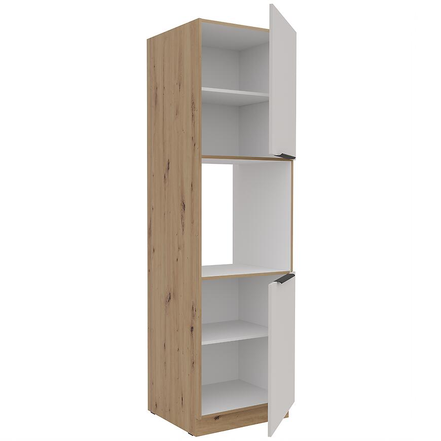 Korpus w jasnym, drewnopodobnym dębie artisan podkreśla naturalny charakter szafki, a cokół w tym samym kolorze zapewnia spójny wygląd całej zabudowy. Brak nóg w zestawie umożliwia łatwe dopasowanie kolumny do pozostałych elementów kuchni.