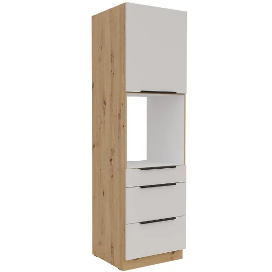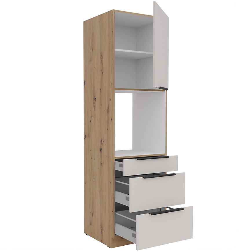 Korpus w jasnym, drewnopodobnym dębie artisan podkreśla naturalny charakter szafki, a cokół w tym samym kolorze zapewnia spójny wygląd całej zabudowy. Brak nóg w zestawie pozwala na łatwe dopasowanie kolumny do pozostałych elementów kuchni.