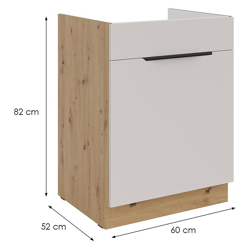 Szafka kuchenna Solea cashmere/artisan 60ZL 1S BB z kolekcji SOLEA to połączenie elegancji, funkcjonalności i subtelnej kolorystyki, które wprowadza do kuchni ciepły i przyjemny charakter. Matowe fronty w odcieniu cashmere zestawione z korpusem dąb artisan tworzą harmonijną kompozycję, idealną do nowoczesnych i klasycznych aranżacji. Wymiary 82 × 60 × 52 cm sprawiają, że szafka doskonale sprawdzi się zarówno w mniejszych, jak i większych kuchniach.