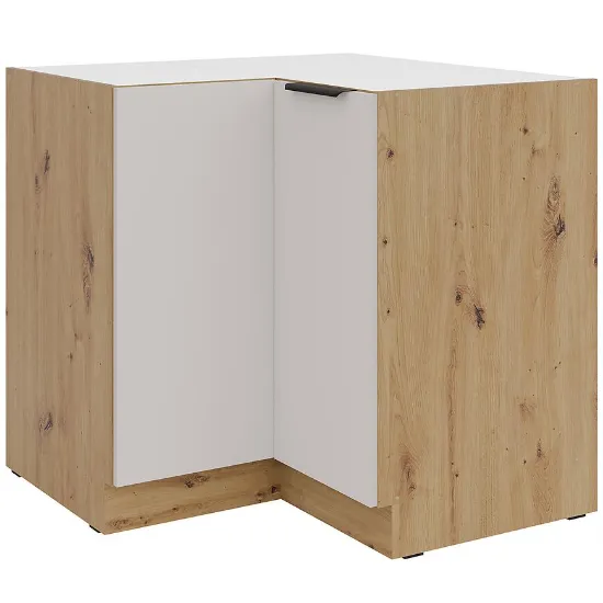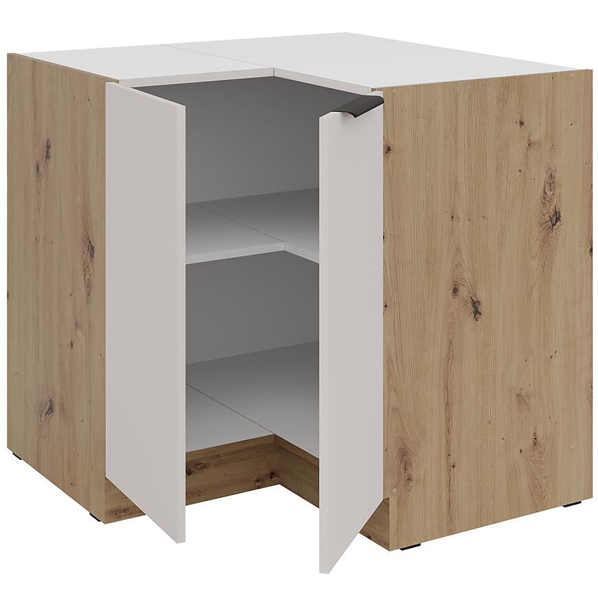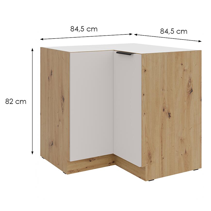 Szafka narożna z kolekcji SOLEA to praktyczny i stylowy element zabudowy kuchennej. Wyróżnia się eleganckim zestawieniem frontów w kolorze cashmere oraz korpusu w dekorze dąb artisan, które nadają całości ciepły, harmonijny wygląd. Matowe wykończenie dodatkowo podkreśla nowoczesny charakter mebla, a solidna płyta laminowana gwarantuje wytrzymałość na codzienne użytkowanie.