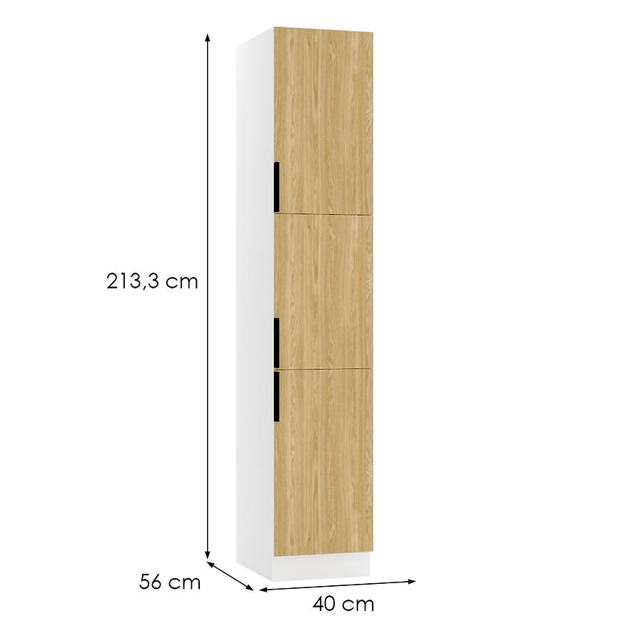 Korpus szafki SONJA utrzymany jest w białym kolorze wykonanej w płyty wiórowej, co tworzy harmonijny kontrast z frontami dębowymi. Cokół w kolorze korpusu dodaje elegancji i spójności całej konstrukcji.