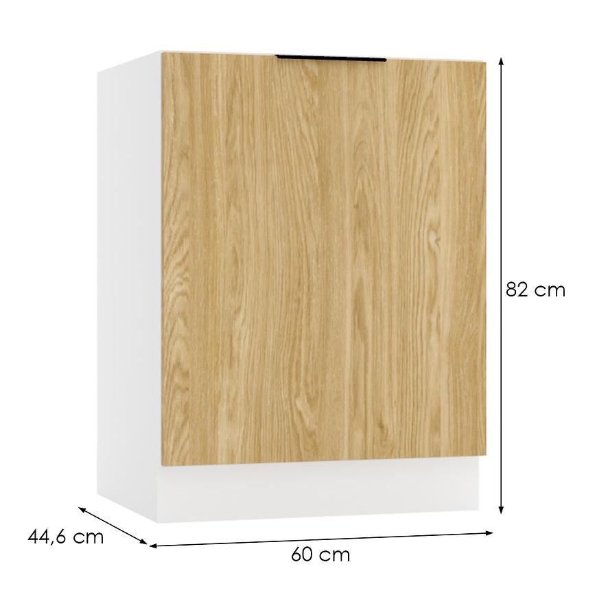 Korpus szafki SONJA utrzymany jest w białym kolorze wykonanej w płyty wiórowej, co tworzy harmonijny kontrast z frontami dębowymi. Cokół w kolorze korpusu dodaje elegancji i spójności całej konstrukcji.