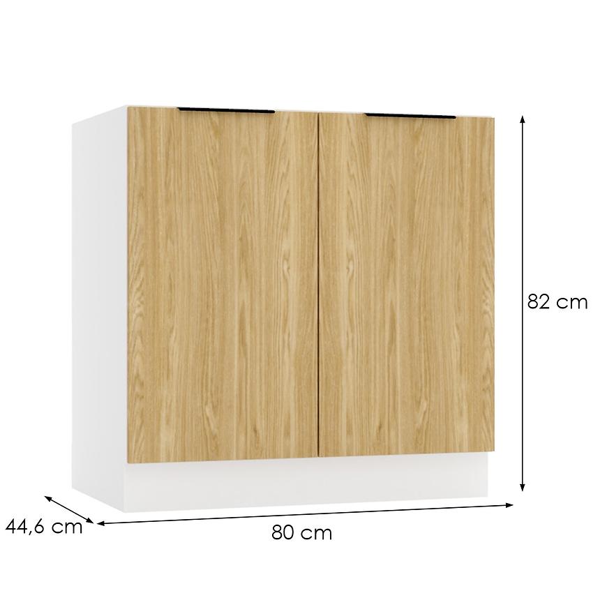 Korpus szafki SONJA utrzymany jest w białym kolorze wykonanej w płyty wiórowej, co tworzy harmonijny kontrast z frontami dębowymi. Cokół w kolorze korpusu dodaje elegancji i spójności całej konstrukcji.