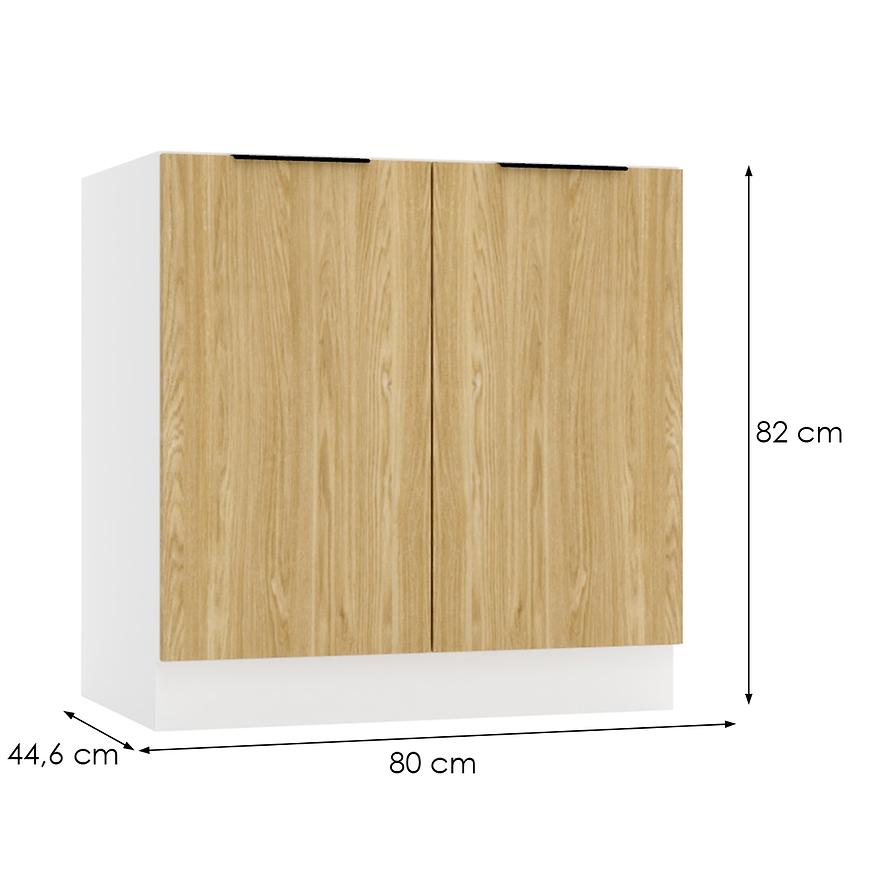 Korpus szafki SONJA utrzymany jest w białym kolorze wykonanej w płyty wiórowej, co tworzy harmonijny kontrast z frontami dębowymi. Cokół w kolorze korpusu dodaje elegancji i spójności całej konstrukcji.