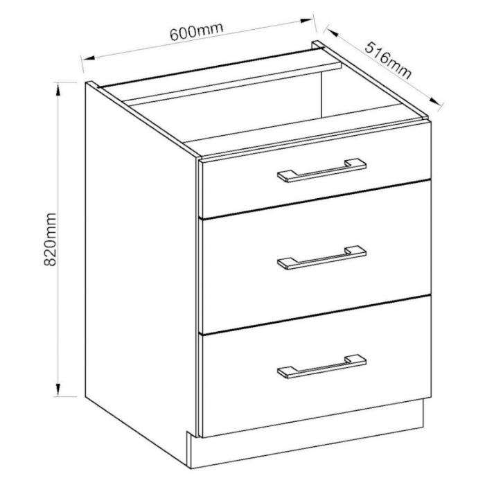 Model 60D 3S BB o szerokości 60 cm, głębokości 50 cm i wysokości 82 cm oferuje praktyczną przestrzeń do przechowywania w dolnej zabudowie kuchennej. Trzy szuflady pozwalają na wygodne sortowanie i szybki dostęp do najczęściej używanych przedmiotów.