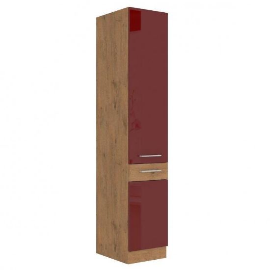 Meble kuchenne Vigo to uniwersalna propozycja dla kuchni zamkniętych oraz otwartych. Korpus wykonany z płyty laminowanej w kolorze Dąb Lancelot. Fronty w kuchni natomiast są wykonane z płyty MDF w kolorze bordo połysk, dodatkowo zabezpieczone folią odporną na termo warunki panujące w kuchni (ABS). Szafki wyposażone są w system cichego domyku Indamatic. Szuflady również posiadają system cichego domyku. Meble Vigo to rozwiązanie dla tych, którzy cenią sobie wygodę i indywidualny styl.