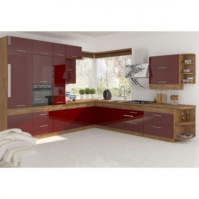 Meble kuchenne Vigo to uniwersalna propozycja dla kuchni zamkniętych oraz otwartych. Korpus wykonany z płyty laminowanej w kolorze Dąb Lancelot. Fronty w kuchni natomiast są wykonane z płyty MDF w kolorze bordo połysk, dodatkowo zabezpieczone folią odporną na termo warunki panujące w kuchni (ABS). Szafki wyposażone są w system cichego domyku Indamatic. Szuflady również posiadają system cichego domyku. Meble Vigo to rozwiązanie dla tych, którzy cenią sobie wygodę i indywidualny styl.