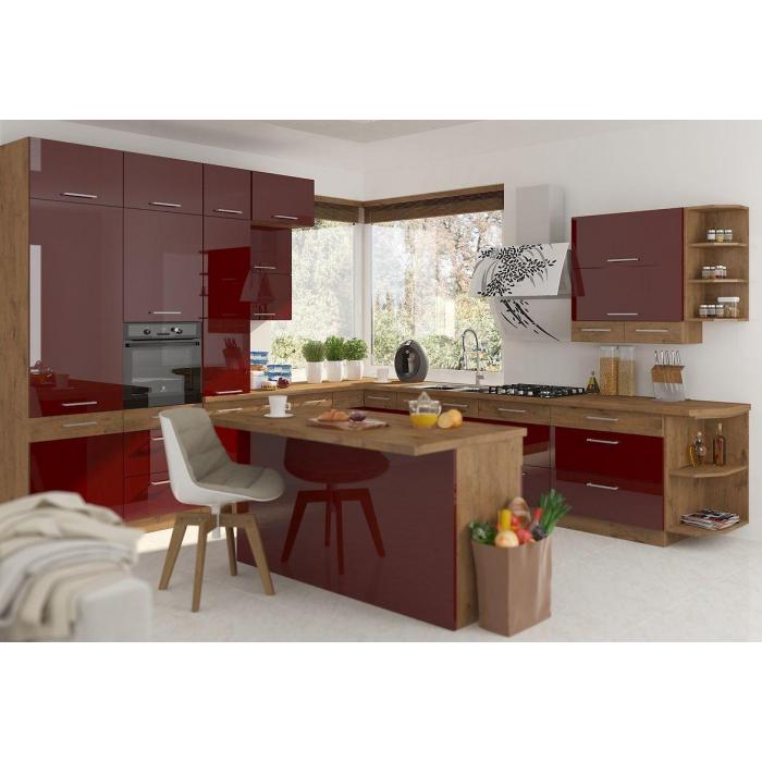 Meble kuchenne Vigo to uniwersalna propozycja dla kuchni zamkniętych oraz otwartych. Korpus wykonany z płyty laminowanej w kolorze Dąb Lancelot. Fronty w kuchni natomiast są wykonane z płyty MDF w kolorze bordo połysk, dodatkowo zabezpieczone folią odporną na termo warunki panujące w kuchni (ABS). Szafki wyposażone są w system cichego domyku Indamatic. Szuflady również posiadają system cichego domyku. Meble Vigo to rozwiązanie dla tych, którzy cenią sobie wygodę i indywidualny styl.