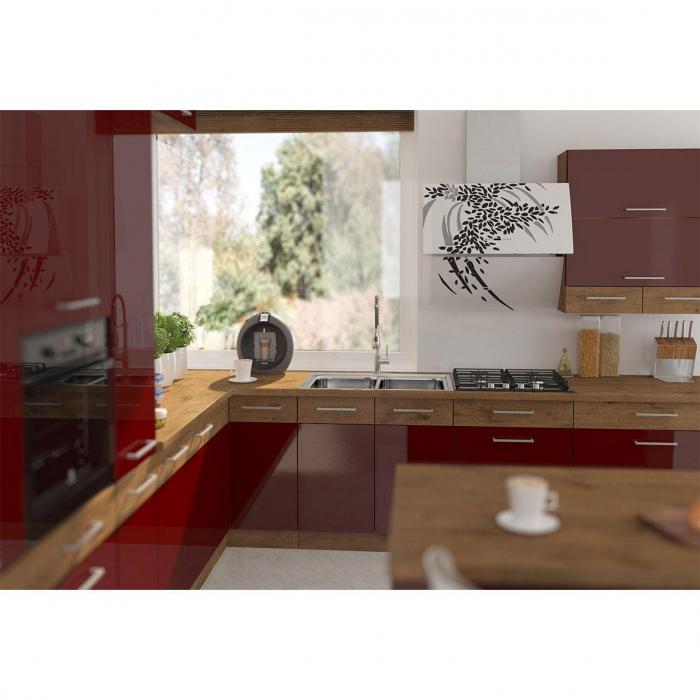 Meble kuchenne Vigo to uniwersalna propozycja dla kuchni zamkniętych oraz otwartych. Korpus wykonany z płyty laminowanej w kolorze Dąb Lancelot. Fronty w kuchni natomiast są wykonane z płyty MDF w kolorze bordo połysk, dodatkowo zabezpieczone folią odporną na termo warunki panujące w kuchni (ABS). Szafki wyposażone są w system cichego domyku Indamatic. Szuflady również posiadają system cichego domyku. Meble Vigo to rozwiązanie dla tych, którzy cenią sobie wygodę i indywidualny styl.