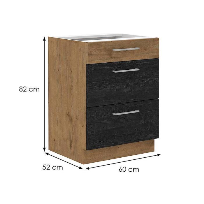 Szafka dolna z trzema szufladami i frontem VIGO Dark 60D 3S BB umożliwia wygodne przechowywanie kuchennych akcesoriów. Cichy domyk szuflad podnosi komfort codziennego użytkowania. Szafka łatwo łączy się z innymi elementami kolekcji VIGO, umożliwiając stworzenie spójnej i praktycznej zabudowy kuchennej.