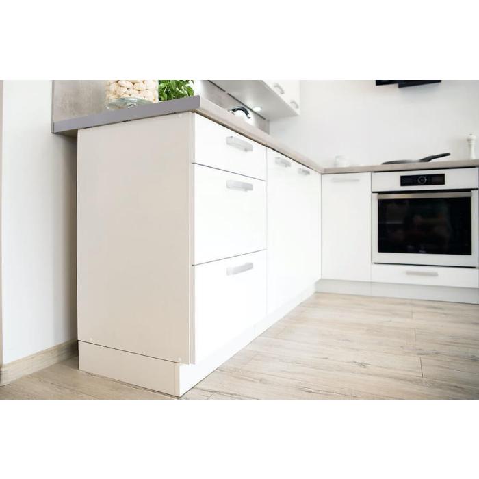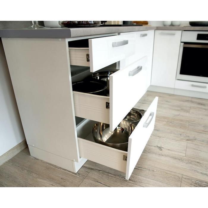 Kuchnia Vita w kolorze białym to nowoczesne wydanie, fronty wykonane z płyty połyskowej z chromowanym metalowym uchwytem oraz metalowe szuflady o głębokości 400mm typu METALBOX. Podnośniki gazowe gwarantują łatwy dostęp do zawartości szafki