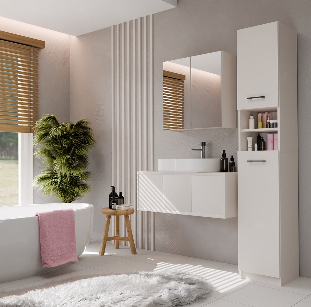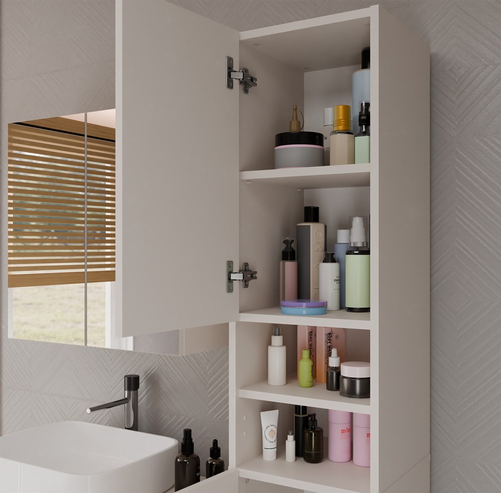 Niewielka głębokość 30 cm oraz kompaktowa szerokość czynią z tego modelu mebel wyjątkowo łatwy do dopasowania. To polecany wybór dla właścicieli małych mieszkań, kawalerek oraz łazienek, w których każdy centymetr przestrzeni jest na wagę złota. Zamiast zajmować cenne miejsce przy podłodze, słupek wykorzystuje przestrzeń pionową, oferując dużą pojemność bez wrażenia przytłaczania. Smukła forma dodatkowo wysmukla wnętrze, dzięki czemu całość zyskuje lekkość.