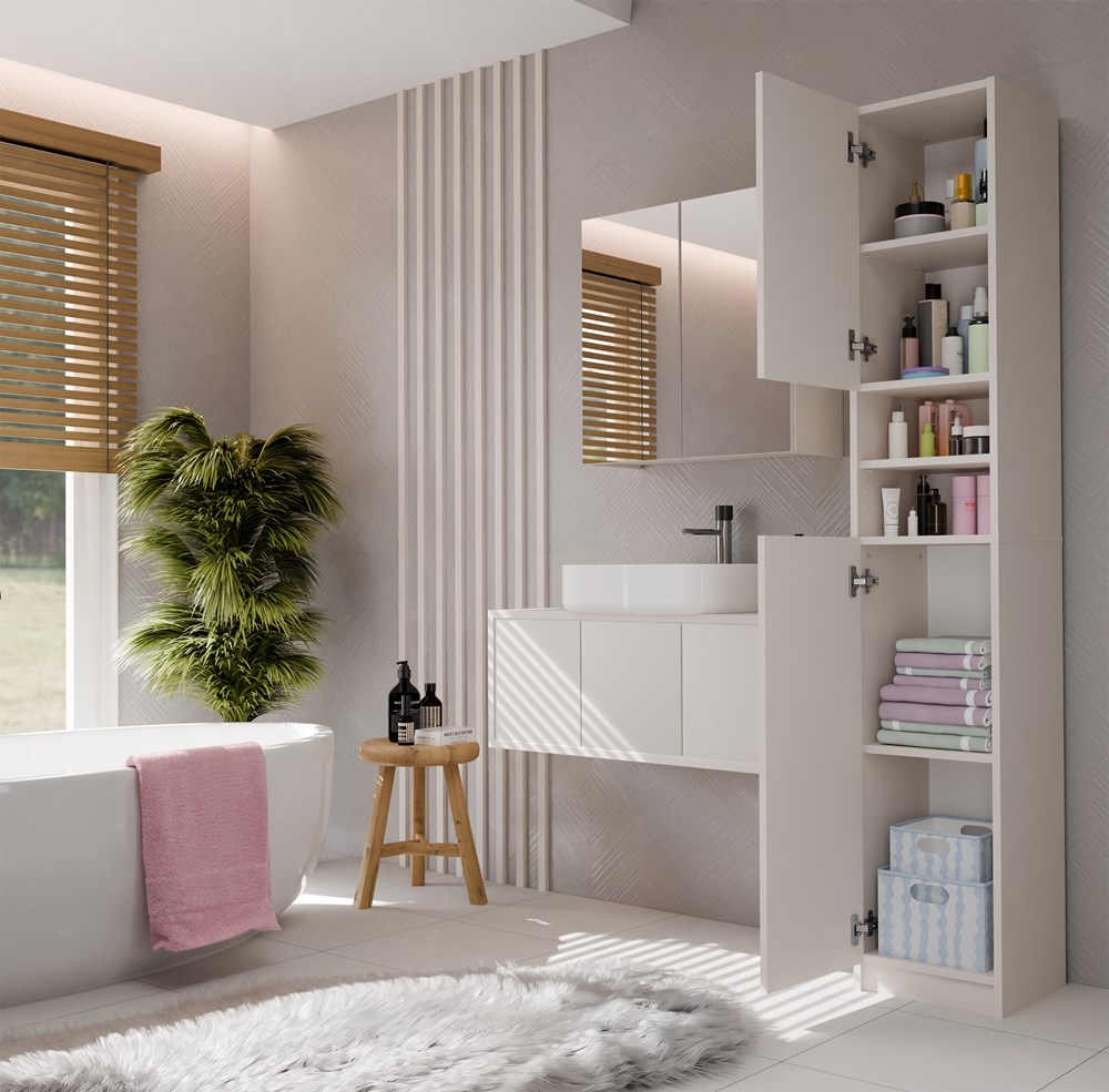 Model ma wymiary dopasowane do większości standardowych łazienek: wysokość 180 cm, szerokość 32 cm i głębokość 30 cm. Pozwala to ustawić go zarówno w narożniku, jak i obok umywalki czy pralki, bez ograniczania swobody ruchu. Słupek można łatwo połączyć z innymi meblami łazienkowymi w kolorze Kaszmir, tworząc spójną zabudowę, która podnosi estetykę całego pomieszczenia. To uniwersalne rozwiązanie, które pasuje do wnętrz utrzymanych w tonacjach skandynawskich, minimalistycznych, industrialnych lub klasycznych.