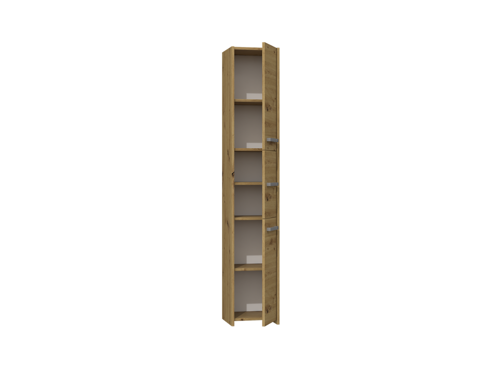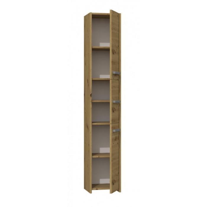 W każdej łazience znajdą się rzeczy, które potrzebują swojego miejsca. Dzięki praktycznym słupkom, skutecznie zapanujesz nad bałaganem, nie zajmując zbyt wiele przestrzeni. Uniwersalny wygląd sprosta oczekiwaniom wszystkich, którzy cenią połączenie prostoty i elegancji. Minimalistyczne uchwyty, wykonane z plastiku w kolorze srebrnym, zapewniają wygodny dostęp do zawartości mebla. Możliwość wyboru strony otwierania drzwiczek – lewostronnie/prawostronnie - bezpośrednio przy montażu. Korpus i fronty wykonane z płyty wiórowej laminowanej w kolorze dąb artisan. Obrzeża zostały wykończone tworzywem PCV które charakteryzuje się dużą wytrzymałością mechaniczną i chemiczną. Powierzchnię mebla czyścić przy pomocy miękkiej szmatki. Unikać stosowania silnie działających środków chemicznych.