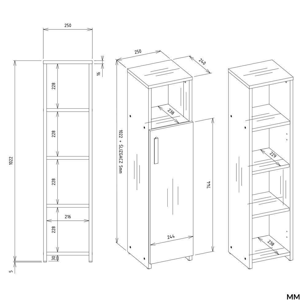 Dzięki swoim wymiarom: szerokości 25 cm, wysokości 102 cm i głębokości 24 cm, szafka Lavo 1D zajmuje niewiele miejsca, a jednocześnie oferuje praktyczne miejsce do przechowywania. Prześwit pod meblem wynoszący 3 cm ułatwia utrzymanie czystości pod szafką, co jest szczególnie istotne w mniejszych łazienkach.