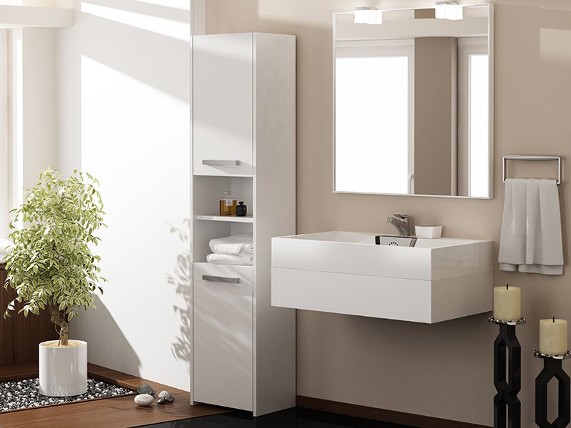 W każdej łazience znajdą się rzeczy, które potrzebują swojego miejsca. Dzięki praktycznym słupkom, skutecznie zapanujesz nad bałaganem, nie zajmując zbyt wiele przestrzeni. Uniwersalny wygląd sprosta oczekiwaniom wszystkich, którzy cenią połączenie prostoty i elegancji. Minimalistyczne uchwyty, wykonane z plastiku w kolorze srebrnym, zapewniają wygodny dostęp do zawartości mebla. Możliwość wyboru strony otwierania drzwiczek – lewostronnie/prawostronnie - bezpośrednio przy montażu. Korpus i fronty wykonane z płyty wiórowej laminowanej w kolorze białym. Obrzeża płyty wykończone tworzywem PCV charakteryzującym się dużą wytrzymałością mechaniczną i chemiczną. Powierzchnię mebla czyścić przy pomocy miękkiej szmatki. Unikać stosowania silnie działających środków chemicznych.