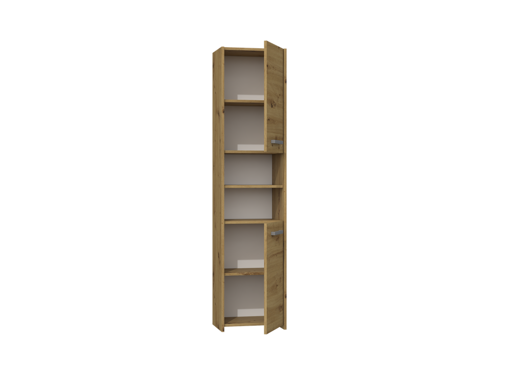 W każdej łazience znajdą się rzeczy, które potrzebują swojego miejsca. Dzięki praktycznym słupkom, skutecznie zapanujesz nad bałaganem, nie zajmując zbyt wiele przestrzeni. Uniwersalny wygląd sprosta oczekiwaniom wszystkich, którzy cenią połączenie prostoty i elegancji. Minimalistyczne uchwyty, wykonane z plastiku w kolorze srebrnym, zapewniają wygodny dostęp do zawartości mebla. Możliwość wyboru strony otwierania drzwiczek – lewostronnie/prawostronnie - bezpośrednio przy montażu. Korpus i fronty wykonane z płyty wiórowej laminowanej w kolorze dąb artisan. Obrzeża płyty wykończone tworzywem PCV charakteryzującym się dużą wytrzymałością mechaniczną i chemiczną. Powierzchnię mebla czyścić przy pomocy miękkiej szmatki. Unikać stosowania silnie działających środków chemicznych.