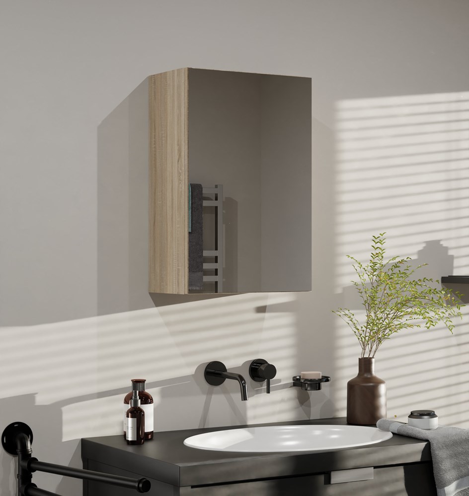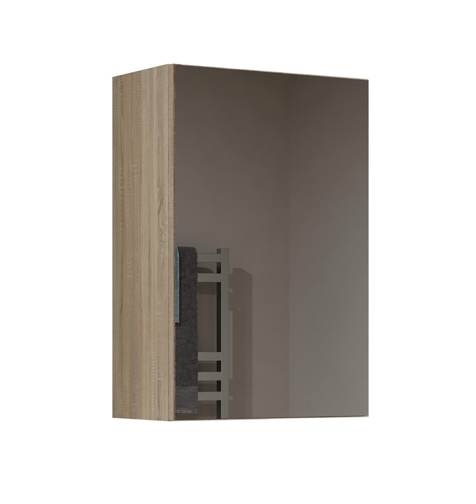 Szafka łazienkowa z lustrem Mir w kolorze dąb sonoma to doskonałe rozwiązanie dla małych i średnich łazienek, gdzie każdy centymetr przestrzeni ma znaczenie. Ta wisząca szafka łazienkowa została specjalnie zaprojektowana, aby efektywnie zagospodarować przestrzeń nad umywalką, jednocześnie dodając elegancji i funkcjonalności do Twojej łazienki.
