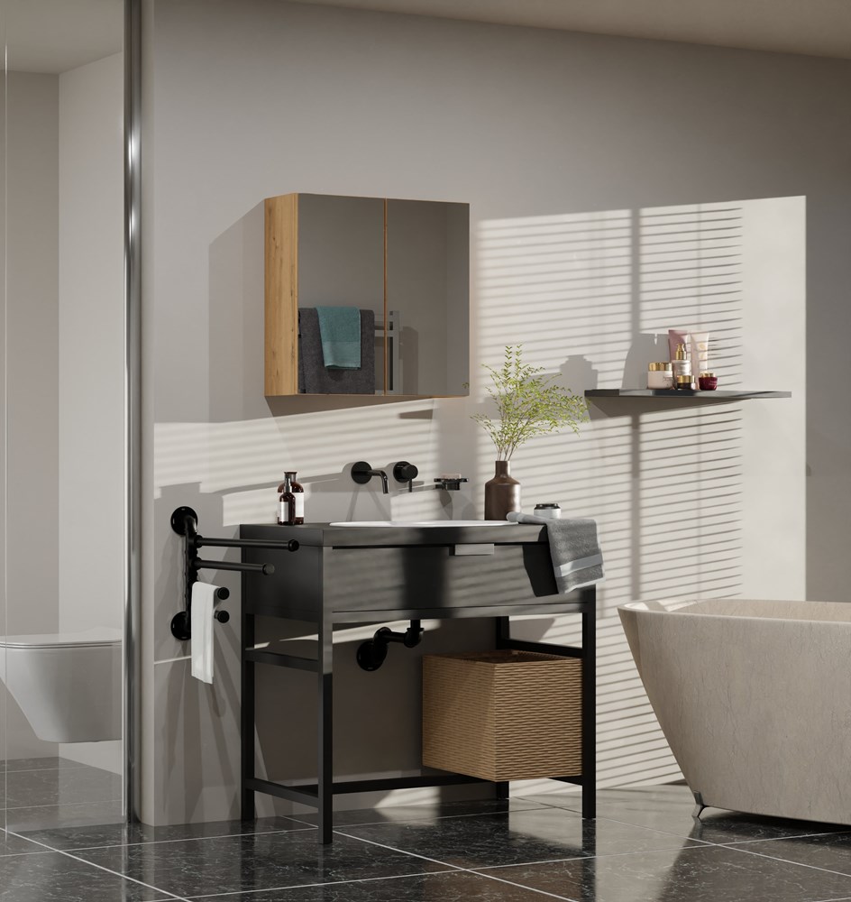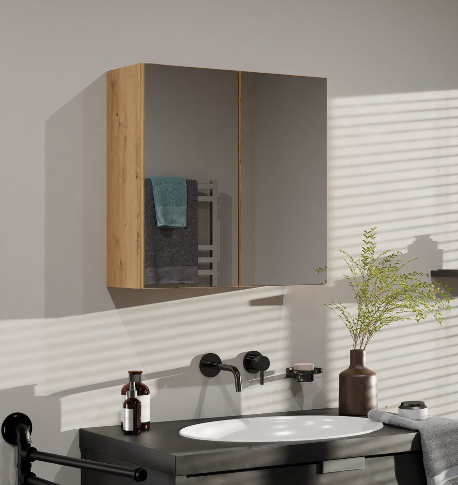 Szafka łazienkowa z lustrem Mir w kolorze dąb artisan to doskonałe rozwiązanie dla małych i średnich łazienek, gdzie każdy centymetr przestrzeni ma znaczenie. Ta wisząca szafka łazienkowa została specjalnie zaprojektowana, aby efektywnie zagospodarować przestrzeń nad umywalką, jednocześnie dodając elegancji i funkcjonalności do Twojej łazienki.