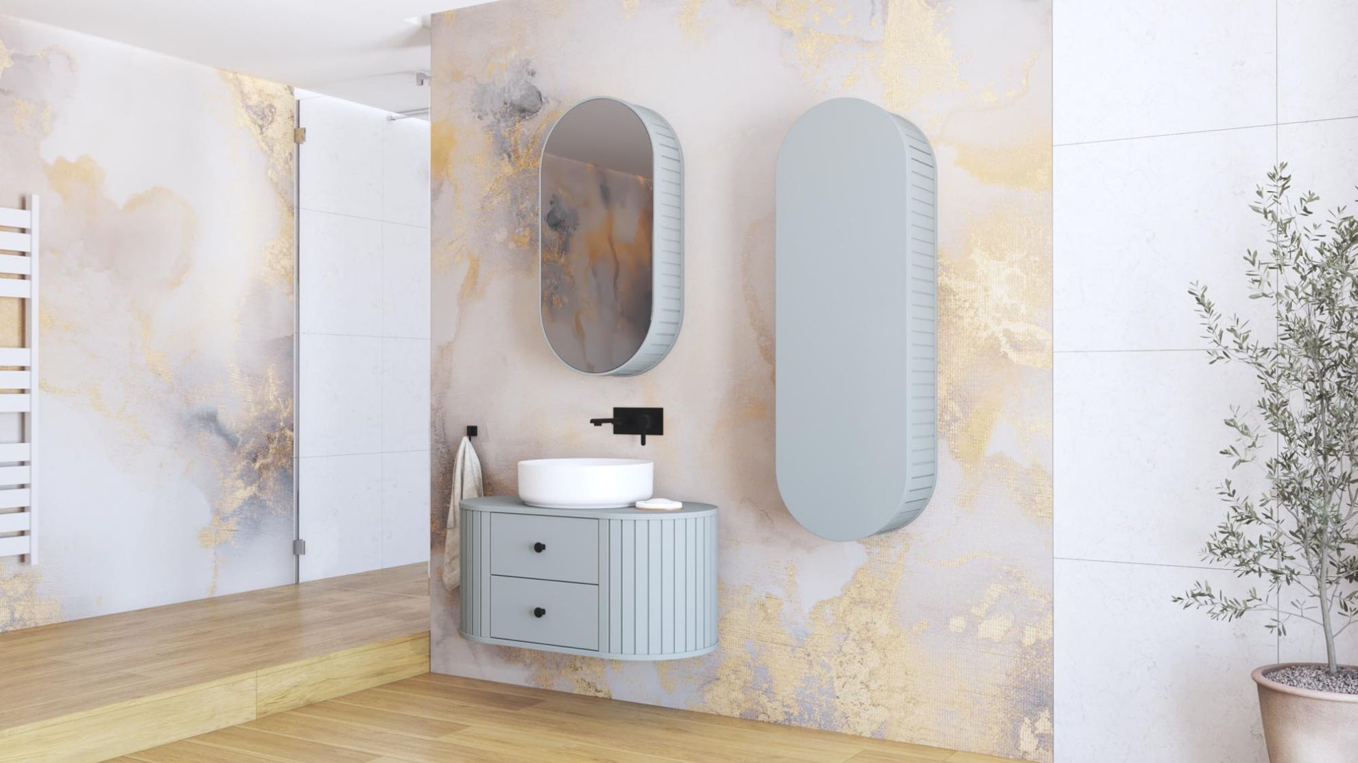 Szafka lustrzana Root 1D w kolorze fiord łączy minimalistyczny, nowoczesny design z praktycznymi rozwiązaniami. Front i korpus w jednolitym odcieniu fiordu nadają bryle spójny, harmonijny wygląd, a neutralny kolor wprowadza do łazienki lekkość i estetyczną równowagę.